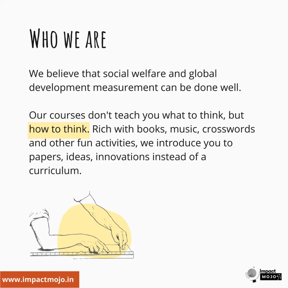 ImpactMojo aims to address this gap by creating accessible courses about MEL, critical thinking, data literacy and understanding development issues. This pedagogical endeavour was launched by Varna Sri Raman, the founder of PinPointVentures.